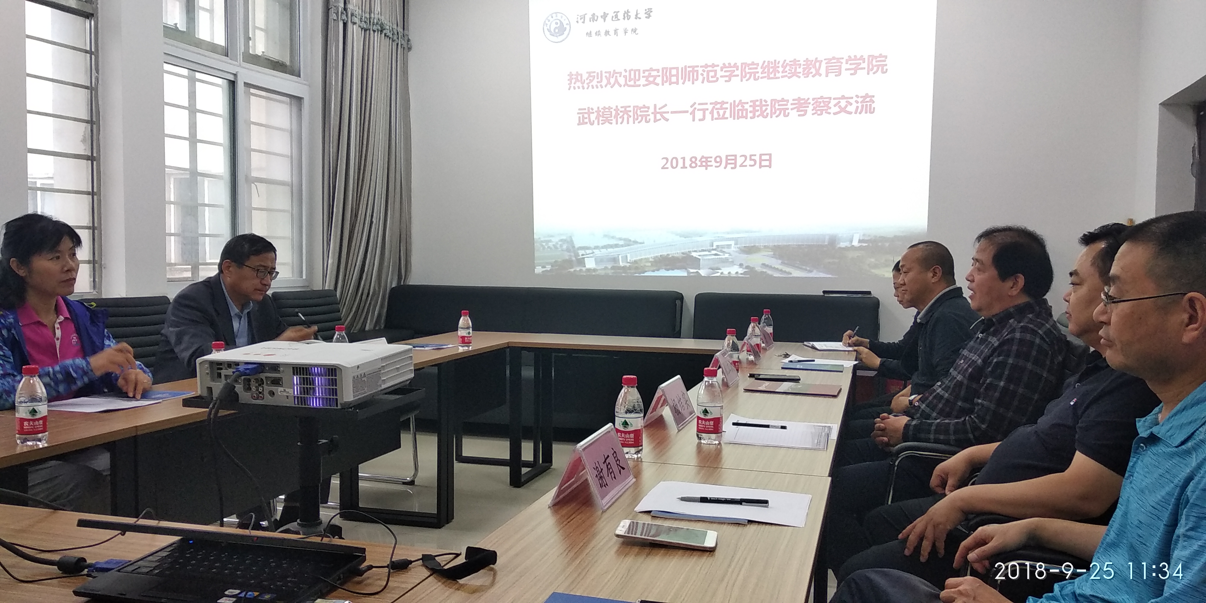 2018年9月25日上午,安阳师范学院继续教育学院武模桥院长一行来我院考察交流。党总支书记杨结实、院长翟立武、党总支副书记谢有良及相关科室负责人参加交流会。