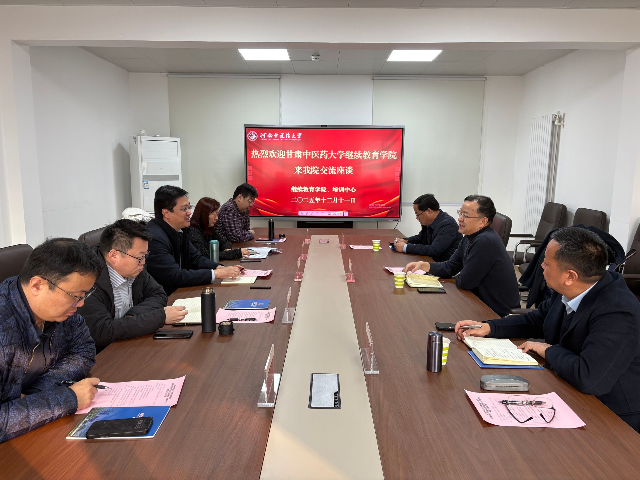 本网讯(文/图 杨平)为深化校际交流,互鉴办学经验,共同探索新时代中医药继续教育高质量发展路径,2025年12月11日,甘肃中医药大学继续教育学院院长李荣科一行到河南中医药大学继续教育学院开展座谈交流。继续教育学院、培训中心班子成员参加会议。